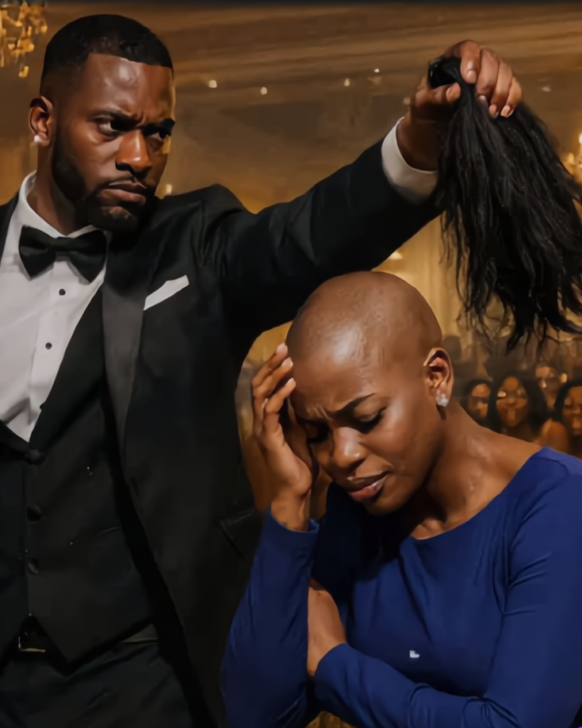 He reached down, snatched the wig clean off her head in one motion—no hesitation, no softness—held it dangling between his fingers like something dirty, then tossed it into the trash can by the bar. It landed without a sound. Rochelle lifted her champagne flute, tipped her head, and took a small sip, as if she’d just been served a private joke.