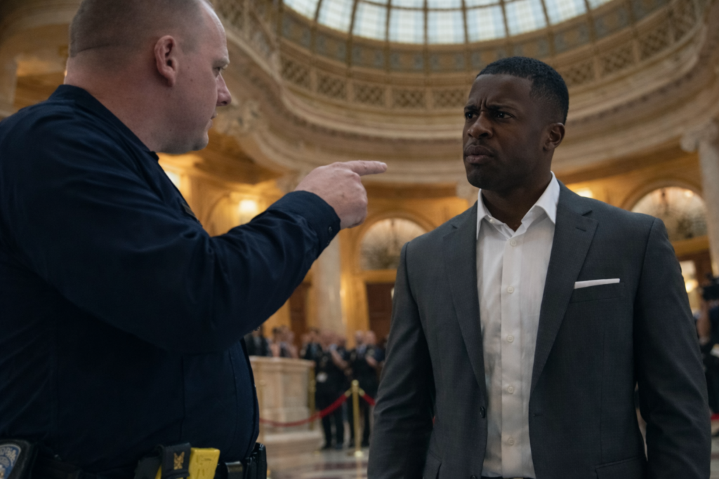City Hall was set for a proud swearing-in—until an officer stopped a Black man at the aisle and demanded ID like he didn’t belong. He stayed calm, invitation in hand, while cameras rolled. | HO
