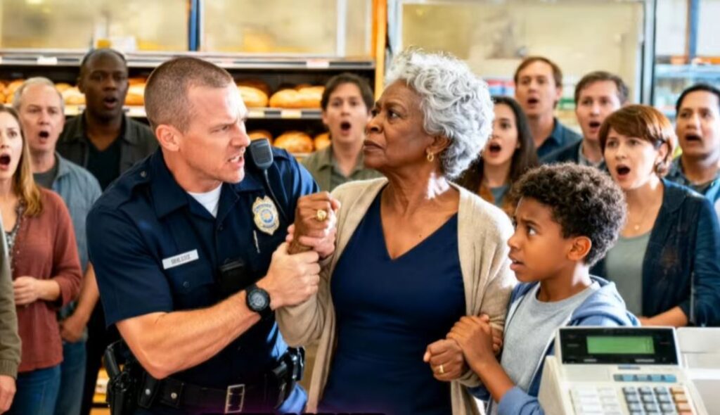 The metal click echoed through Braxton’s Family Market on a quiet Saturday morning, sharp enough to make the soft jazz over the ceiling speakers feel like a cruel joke. A 68-year-old grandmother stood cuffed between the peaches and the bread aisle, her shoulders squared like she refused to shrink even when the room tried to make her. Her 10-year-old grandson pressed his face into her coat and sobbed so hard his whole body shook. The officer wore a small, satisfied smirk, as if the scene was proof of something only he could see.