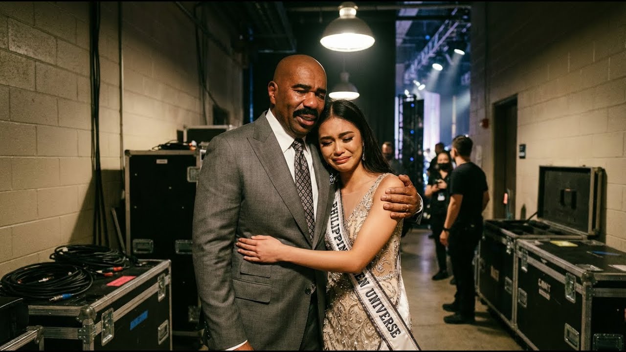 That’s when Steve Harvey broke down—not a neat single tear, but the kind of sob that shakes the body because it comes from a place deeper than performance. He pulled Sophia into a hug right there in that corridor, and for a solid minute, they just stood there crying while the pageant world rushed around them on the other side of the walls.